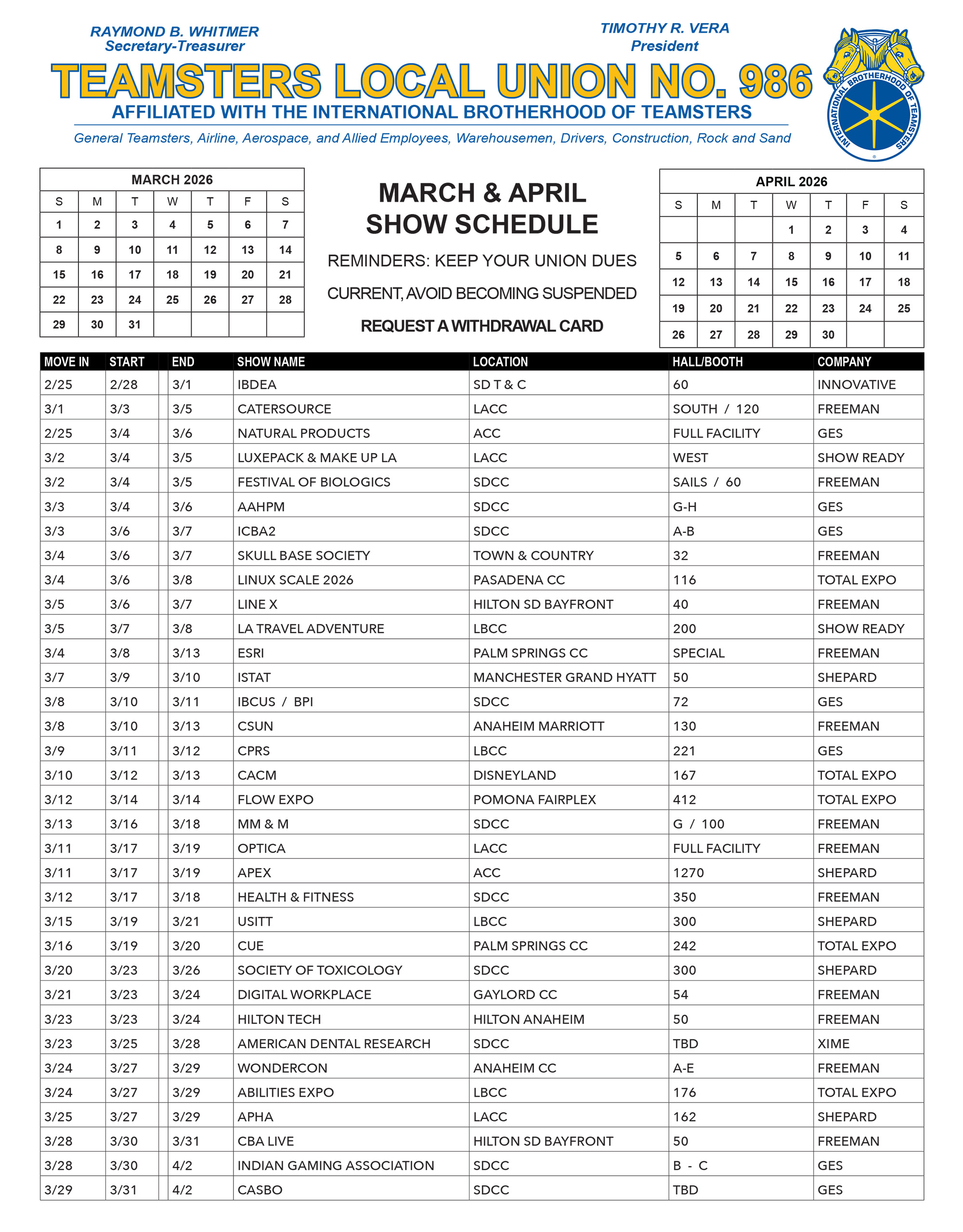 Please note - This schedule has the most up to date information available based on the information supplied, but in no way should it be construed as a complete list. Shows and show schedules are subject to change. Check with dispatch for any recent updates or unlisted events.